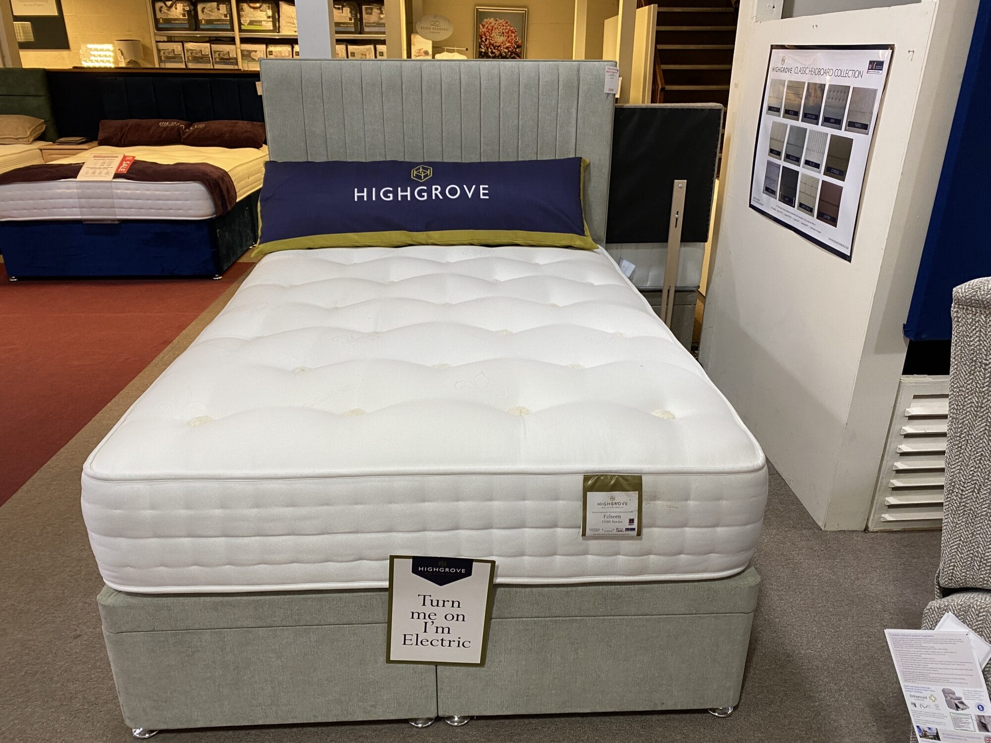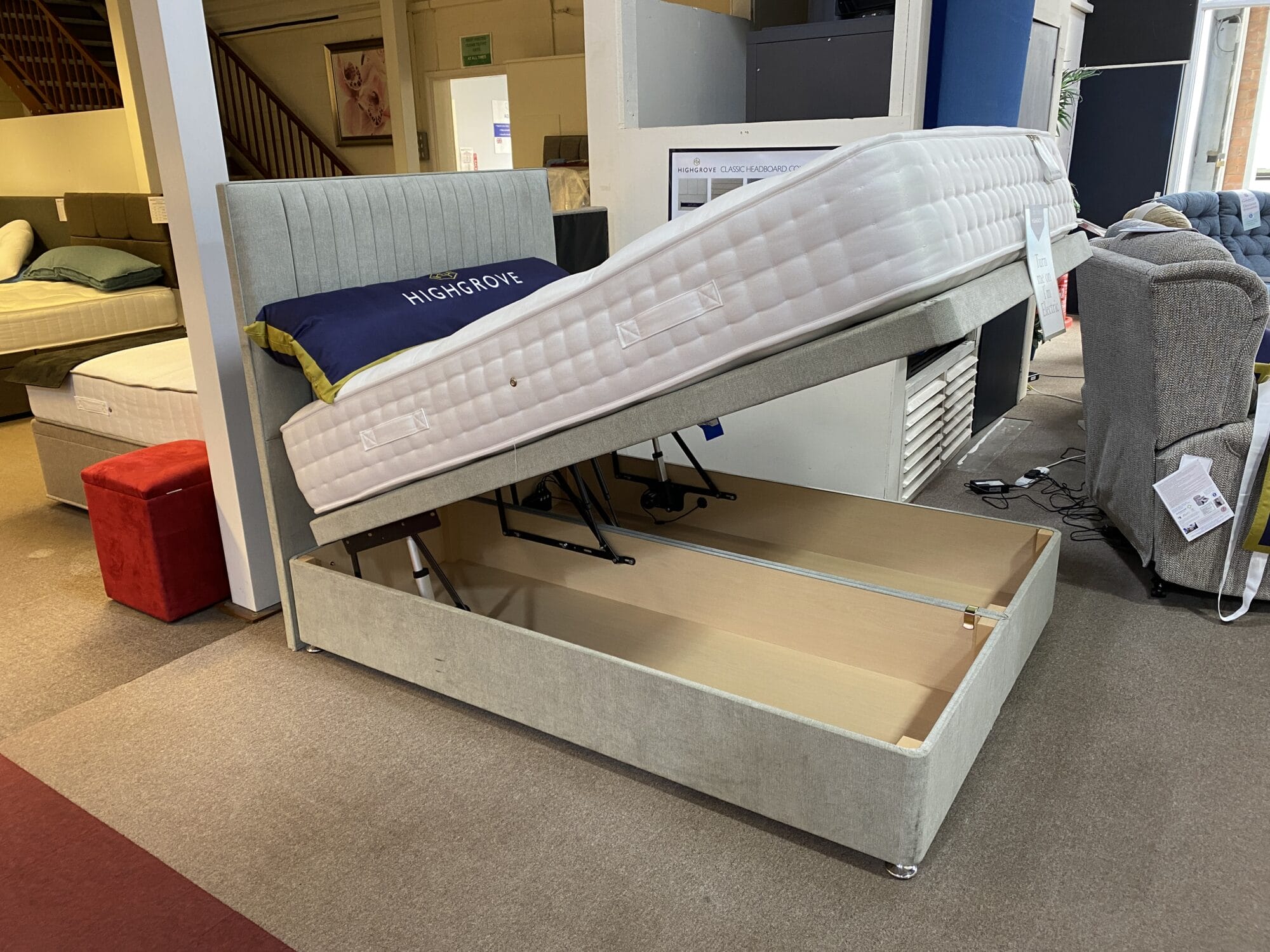Ex display Highgrove 4’6″ (double size) electrically operated ottoman bed set in grey fabric with a floor standing headboard. the ottoman is controlled by remote control